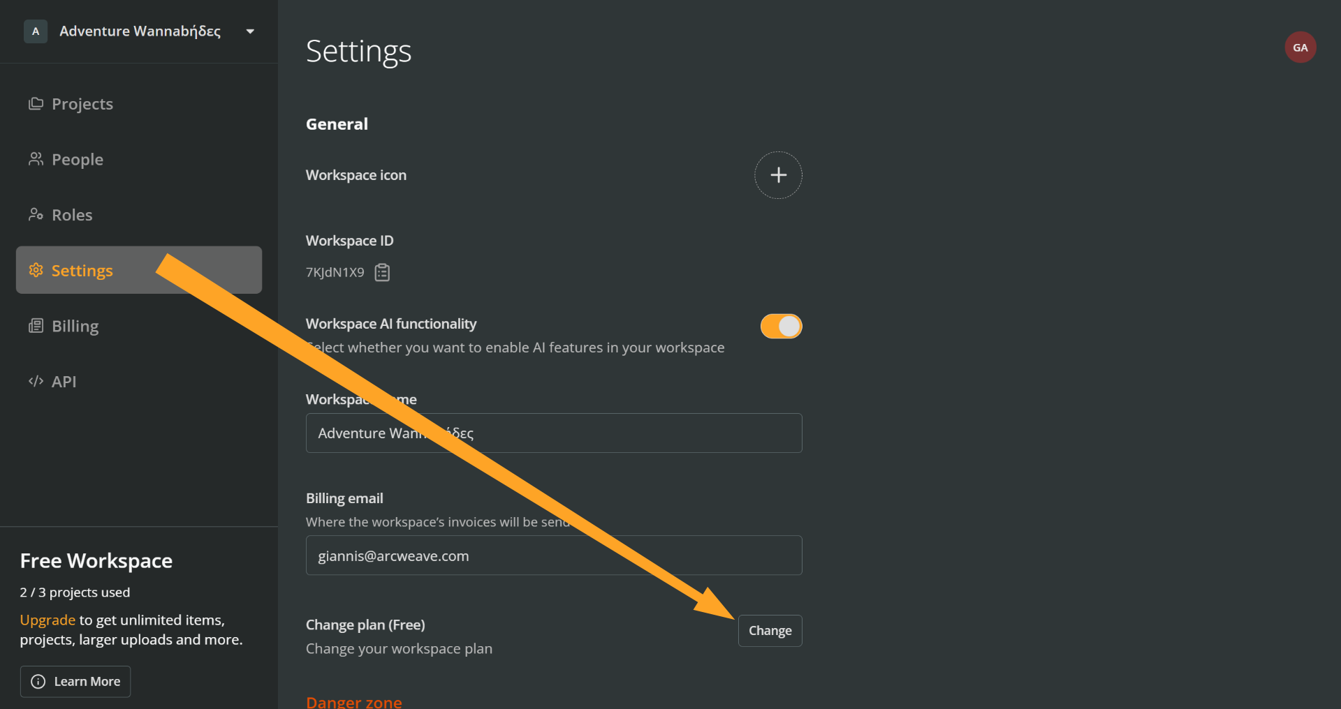 b. From the Settings section: Go to your workspace Settings > Change plan and press Change, to open the upgrade modal.